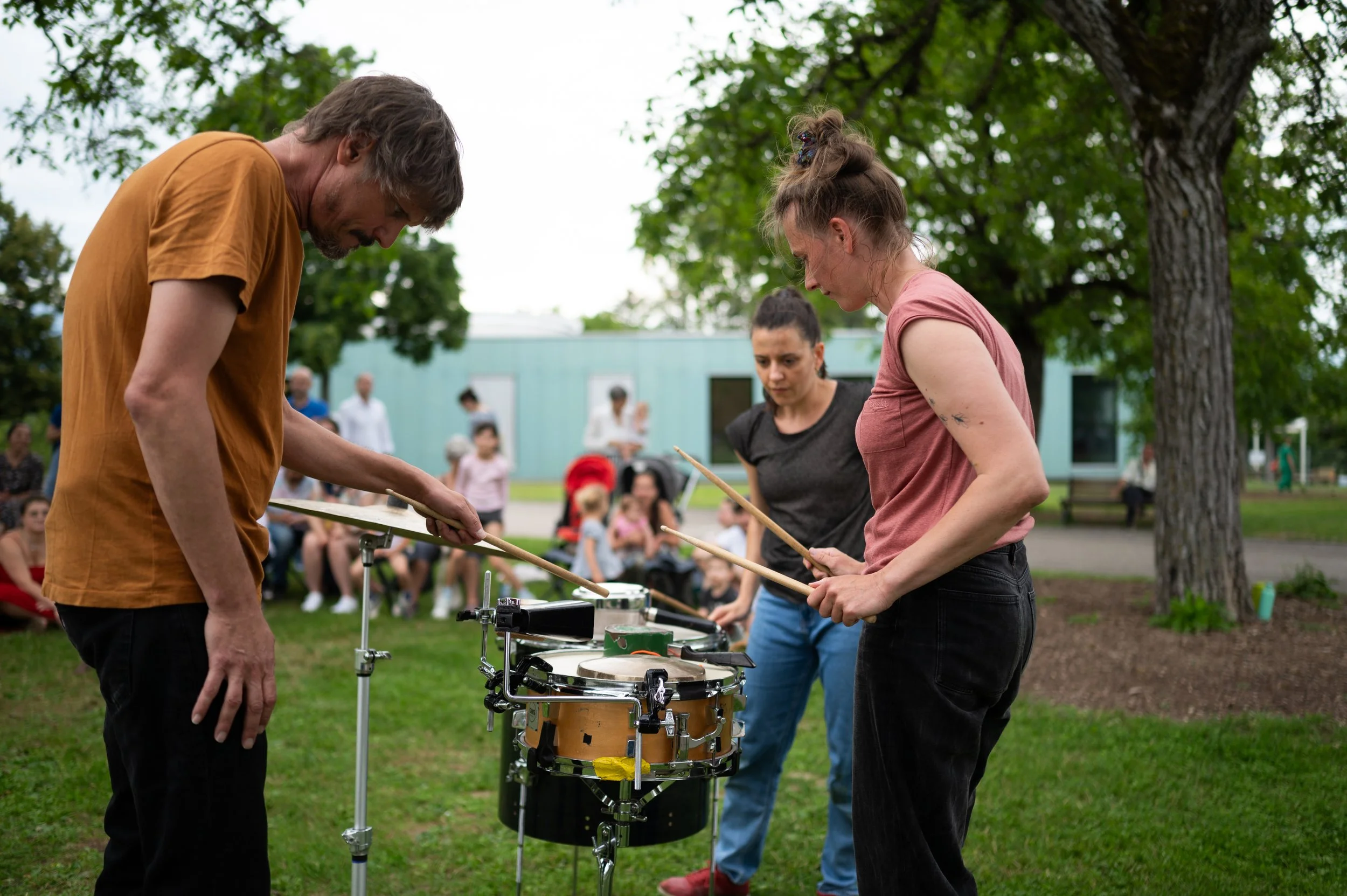 KlangTanz#3 est une création chorégraphique et musciale pour un batteur et deux danseuses, un trio qui explore les rôles de chacun·e et en éprouve les limites. Les danseuses et le musicien interfèrent sur les sons de l’autre, interviennent sur les corps et les instruments, ou encore deviennent instruments mouvants. La géométrie de l’espace se transforme selon leurs interactions réciproques et par le déplacement du matériel du batteur dans l’espace. Cette transformation de l’espace raconte aussi la rencontre entre le son et le mouvement comme une rencontre entre deux personnes: bagages différents, mise en commun de ces bagages, test des limites de l’autre en envahissant son espace et en le gênant dans sa tâche.
